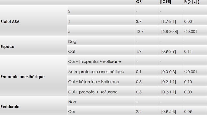 Variables explicatives: ASA, espèce, type de procédure, protocole anesthésique, âge, urgence de la procédure.