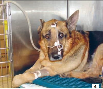 Une étude portant sur des chiennes saines qui ont subi une ovariohystérectomie a montré que la supplémentation en oxygène pendant les 2 heures qui suivent l’intervention à l’aide d’une sonde nasale permet d’améliorer la saturation tissulaire en oxygène [20]. Une autre équipe a recherché l’influence du décubitus chez des chiens ne recevant pas de supplémentation en oxygène dans une unité de soins intensifs. Les animaux placés en décubitus sternal ont présenté une PaO2 supérieure à celle des individus en décubitus latéral [14]. Ainsi, il peut être conseillé de supplémenter l’animal en oxygène à l’aide d’une sonde nasale et de le positionner en décubitus sternal (photo 4).