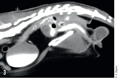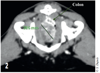 Cette masse déplace le côlon dorsalement à gauche. Elle se trouve à 18 mm de la vessie dorsalement à la symphyse pubienne (figure 2).