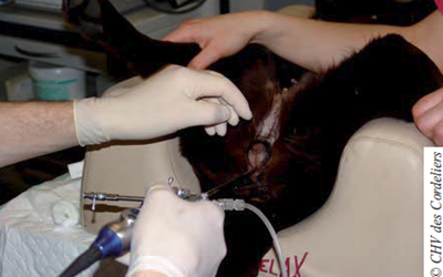 Un examen endoscopique urinaire est proposé pour évaluer le degré d’envahissement de la masse dans les zones difficilement accessibles par l’échographie et pour effectuer des prélèvements histologiques. La prémédication est assurée par de l’acépromazine (20 μg / kg IM) et du chlorhydrate de morphine (0,1 mg / kg IM). L’induction est réalisée au propofol à dose d’effet et le maintien à l’isoflurane à 2 % dans 1 litre d’oxygène. La chienne est placée en décubitus dorsal et une optique rigide de 2,7 mm est introduite dans les voies vaginales (photo 2).