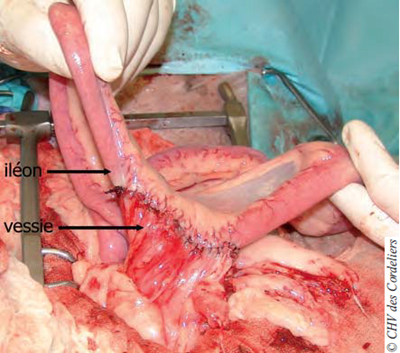 Puis, une cystoplastie par patch iléal est réalisée, suturant la vessie sur la séreuse intestinale avec un fil de polyglécaprone (monocryl® 3.0) (figure 1 et photo 9).