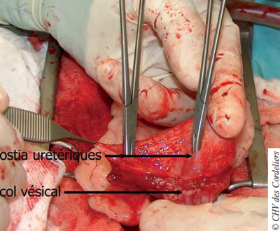 L’organe est incisé sur sa face ventrale, du col à l’apex (photo 6). Compte tenu de la taille de la masse, une cystectomie subtotale est envisagée. L’intégrité des ostia urétériques est vérifiée par l’introduction d’une pince hémostatique (photo 7).