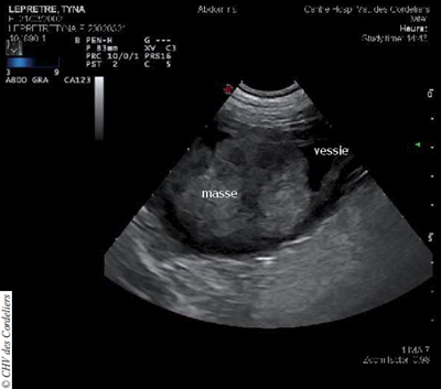 Photo 1 : Volumineuse masse vésicale d’aspect hétérogène.