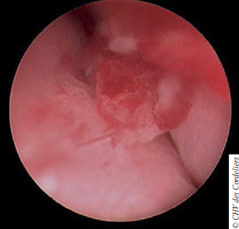 L’endoscopie se poursuit par le cathétérisme urétral ; aucune lésion visible n’est objectivée. L’examen de la vessie ne révèle pas de lésion en regard du trigone. En avant de celui-ci, la présence d’une masse hémorragique occupant la quasi-totalité de la lumière vésicale est confirmée.
