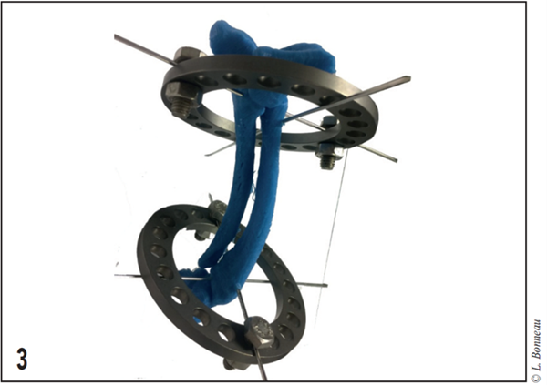 Figure 3 – Impression 3D d’un radius/ulna et planification préopératoire d’une chirurgie correctrice de radius curvus à l’aide d’un fixateur externe d’illizarov.