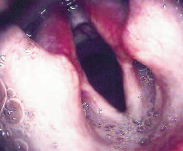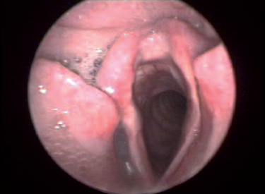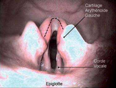 Figure 2 : Sur ce larynx paralysé, on peut visualiser l’inflammation importante des cartilages arythénoïdes.