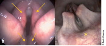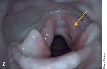Déterminer le côté le plus atteint est nécessaire lorsqu’un traitement chirurgical est envisagé : l’intervention doit concerner l’aryténoïde présentant la plus faible abduction (figures 1 et 2).