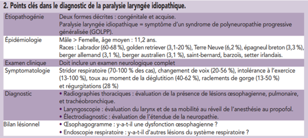 Les paralysies laryngées acquises sont le plus souvent idiopathiques. Il y a de plus en plus de preuves démontrant que cette affection est le reflet d’une polyneuropathie progressive généralisée (Shelton 2010) dont les manifestations précoces sont un défaut d’abduction aryténoïdienne et la dysfonction œsophagienne.