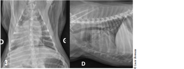 Des radiographies thoraciques (3 vues) constituent le premier examen à réaliser dans l’investigation d’une obstruction des voies respiratoires supérieures. Cela permet d’explorer l’éventuelle présence de lésions pulmonaires, trachéo-bronchiques ou œsophagienne (bronchopneumonie paraspiration (figure 3), œdème pulmonaire post-obstructif, mégaœsophage).