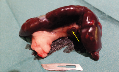 Photo 4. Pièce d’exérèse après splénectomie : une masse ronde est observée à la base de celle-ci, l’analyse histopathologique conclut à un ganglion (flèche). Une splénomégalie conséquente mais de déformation majeure est remarquée.