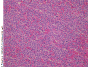 Un lymphome ganglionnaire de haut grade de morphologie similaire au lymphome préalablement diagnostiqué dans la rate est mis en évidence à l’examen histologique.