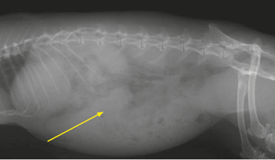 Photo 2. Radiographie abdominale de profil, une masse homogène est observable dans l’abdomen crânial, cranio-caudalement au foie (flèche). Aucune métastase d’une éventuelle néoplasie n’est observable en région pulmonaire ou sur le squelette.