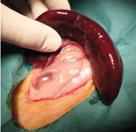 La technique chirurgicale débute par une incision de la paroi abdominale médiale sur 10 cm et une extériorisation délicate de la rate (Photo 3)