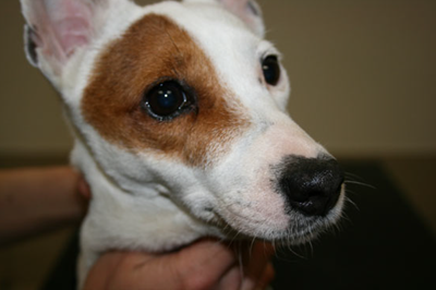 Figure 1. Photograph of a 6-year-old Jack Russell Terrier neutered female dog. Note the mass around the medial canthus of the right eye of 5-month duration. No ocular discharge was observed.