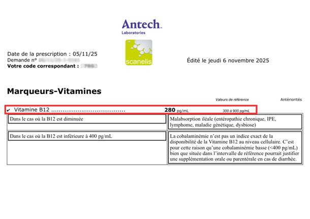 - une hypocobalaminémie compatible avec un trouble de l’absorption et une dysbiose majeure et une hyperfolatémie compatible avec une dysbiose majeure,
