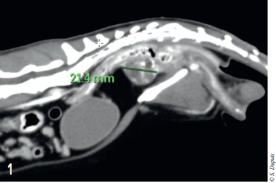 Une affection prostatique est suspectée : tumeur, prostatite ou kyste. Une tumeur urétrale ne peut être exclue et nécessiterait une biopsie difficile à réaliser compte tenu de la localisation. Une cytoponction à l’aiguille fine est difficilement réalisable en raison de la situation de la masse et de son caractère cavitaire communiquant avec l’urètre.