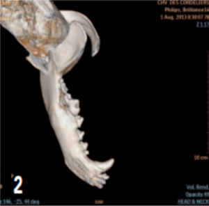 Photo 2 : Reconstruction en 3D montrant la lyse osseuse de la mandibule s’étendant de la carnassière à la deuxième molaire.