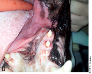 Photo 7 : La rétraction des babines par un assistant permet un accès à la partie caudale de la mandibule. La gencive a été incisée et élevée de l’os.