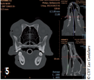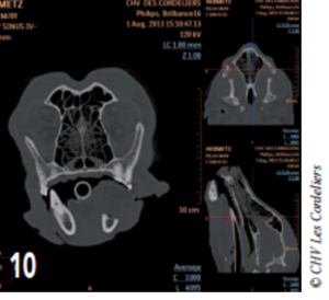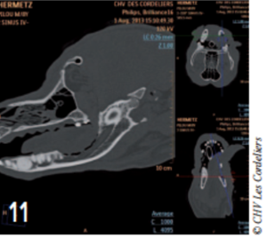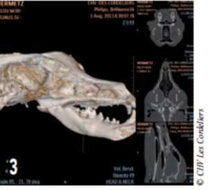 Le scanner a révélé la présence d’une lyse osseuse de l’os alvéolaire mandibulaire s’étendant de la racine dorsale de la carnassière jusqu’à la racine caudale de la deuxième prémolaire (photos 2 à 6).