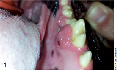 Le cas nous a alors été référé. Lors de sa consultation, trois semaines après la première excision, l’examen de la bouche sous anesthésie générale révélait à nouveau la présence d’un tissu bourgeonnant sur la face linguale de la gencive en regard de la carnassière (photo 1).