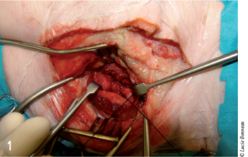 Figure 1 : Une suture Tie Back est mise en place entre les cartilages aryténoïde et cricoïde afin d'induire une abduction de l'aryténoïde atteint. Cette abduction peut être contrôlée à l’aide de la laryngoscopie per-opératoire.